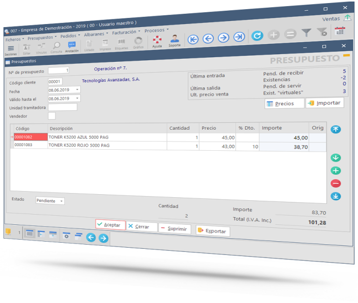 Gestión de ventas (presupuestos, pedidos, albaranes y facturación).