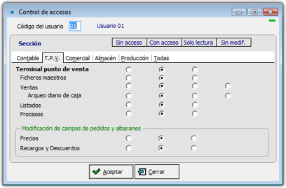Combinando el control de accesos con las palabras de paso para los usuarios -asignadas desde la opción Usuarios del menú Ficheros-, se consigue un completo control sobre los accesos a las distintas acciones del programa en entornos multi-usuario (redes locales).