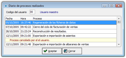 El diario de procesos muestra una relación de los procesos realizados por cada usuario.