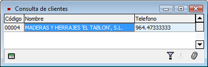 Si pulsamos <F4> desde la entrada 'Código de cliente' se mostrará la ventana de consulta correspondiente.