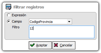 Lo que hemos hecho es 'filtrar' los registros mostrados restringiendolos a los que tengan un código de provincia igual a 12. Si pulsamos <Intro> para volver al mantenimineto comprobaremos que solo se muestran los clientes de la provincia de Castellón (código 12). Podemos navegar por los registros filtrados utilizando los botones y las teclas de navegación.