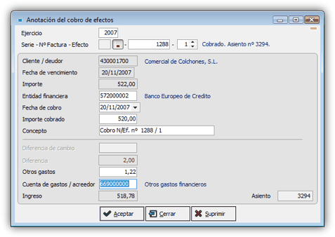 Mediante esta ventana podrá crear las anotaciones correspondientes al cobro de efectos. Si intenta introducir un efecto que se encuentra incluido en una remesa - Mantenimiento de remesas de cobro -, le aparecerá una ventana de advertencia, y no podrá anotar el cobro a no ser que lo excluya de la remesa a la que pertenece. Una vez haya anotado el cobro, el programa crea de forma automática el asiento contable correspondiente a dicho cobro.