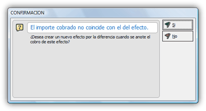 NOTA: Si NO ha activado la casilla "Activar el uso de divisas", en el caso de que en la casilla Importe cobrado introduzca un importe inferior al del efecto, le aparecerá una ventana de advertencia para preguntarle si desea crear un nuevo efecto con el resto de importe pendiente de cobro.