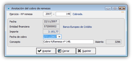Introduzca el número de la remesa de la que desea anotar su cobro. Una vez haya introducido esta entrada, el programa le muestra el estado en el que se encuentra, así como la fecha, entidad financiera e importe total al que asciende la suma de los efectos incluidos en ella.