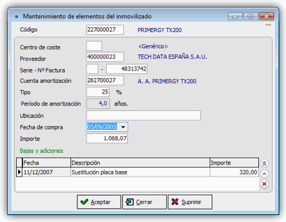 En la tabla que le aparece a continuación puede introducir los importes correspondientes a las incorporaciones o extracciones del elemento actual. Por ejemplo, si elemento de inmovilizado es un automóvil, y se le añade algún componente como pueda ser el cambio de las cuatro ruedas, debería introducir la fecha de dicho cambio, una pequeña descripción y el importe que supone en positivo. Si posteriormente el automóvil tuviera un accidente y tuviera que darse de baja, debería introducir el valor actual del automóvil en negativo.