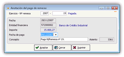 Para poder anotar el pago de una remesa, ésta debe constar como "Pendiente de pago".