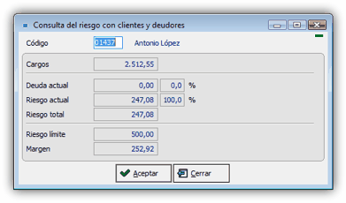 Mediante esta ventana puede consultar información acerca del cargo, deuda actual y riesgo existente con los clientes y deudores.