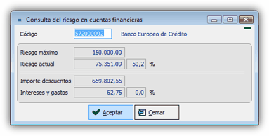 Mediante esta ventana puede consultar información acerca del riesgo existente en las cuentas financieras dadas de alta - ventana de Mantenimiento de cuentas financieras -, calculados a partir de la gestión de los efectos a cobrar. Para más información consulte Mantenimiento de efectos a cobrar.