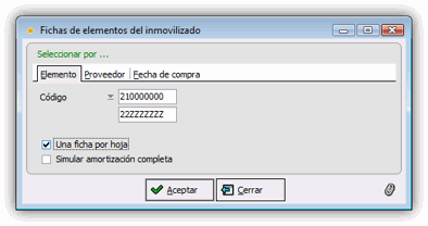 Elija el tipo de selección por la que desea listar los elementos de inmovilizado, e indique los rangos inicial y final en cada uno de los casos. Dispone de tres tipo de selección: