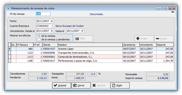 Mediante ella podrá confeccionar una relación de las remesas que cumplan las condiciones impuestas. En dicha relación el programa irá detallando los efectos incluidos en cada una de las remesas.