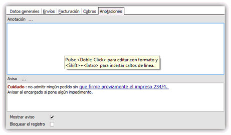 Puede acceder a la información contenida en ella pinchando sobre la pestaña Anotación. En ella tiene la posibilidad de introducir información complementaria sobre el cliente, así como bloquear el registro para impedir que se realice ningún documento con este cliente y mostrar un aviso en el momento de confeccionar un documento con el cliente.