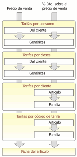 El programa le permite detallar precios y descuentos sobre ventas desde diferentes opciones. A la hora de proponer precios y descuentos por defecto, el programa busca en los ficheros y en el orden en que se representa en el siguiente diagrama, aplicando el precio y/o descuento que primero encuentra atendiendo a los siguientes criterios de selección :