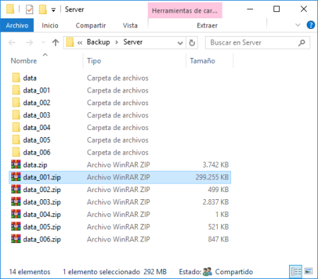 El servidor hace una copia de los datos de todas las Empresas (directorios data y data_XXX) así como de los documentos e informes (doc_XXXy reports_XXX) y los comprime en formato .zip en un fichero con el mismo nombre que el directorio de datos (data.zip, data_XXX.zip) :